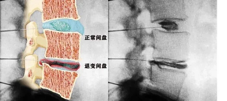 当我们的腰椎间盘受到过度的应力、先天椎体周边韧带不够强健、老化、反复的不正确使用或者是外伤以及其他一些原因会导致我们的腰椎间盘发生退变,产生一些无菌性的炎症,导致患者出现弯腰、蹲起等活动时明显的腰部疼痛。大家看下图就可以明白,腰椎间盘退变和正常腰椎间盘的区别。