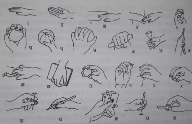 非抓握动作与抓握动作两大类,非抓握动作包括悬浮、约束、推、压、触、勾状抓握等;抓握动作又分为力性抓握与精细抓握,前者包括球形柱状抓握及拉,精细抓握包括指尖捏、指腹捏、侧捏及三指捏。